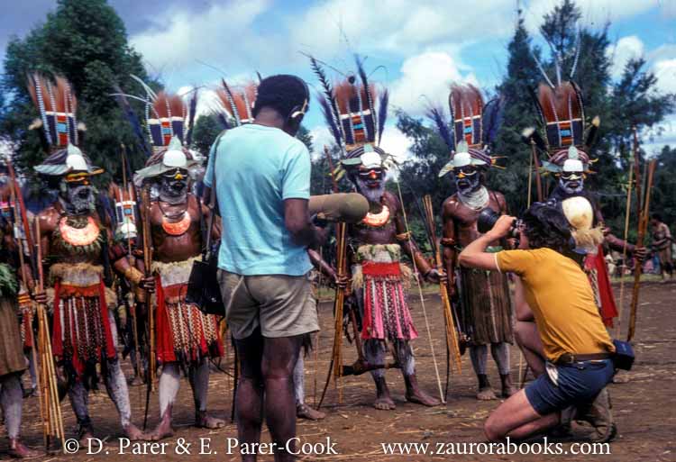 From the Archives: 1978_3. David Parer filming a tribal sing-sing near Mendi, Southern Highlands, Papua New Guinea for the film “Voices in the Forest”. The decorative bird plumes worn by the dancers are from birds of paradise; the pearl shells around their necks are a sign of status.