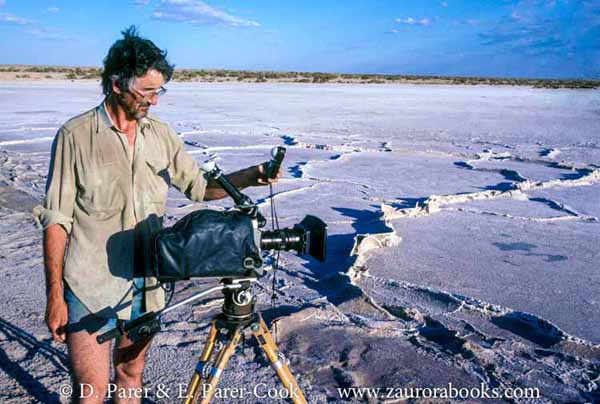 From the Archives: 1985_7. David Parer filming the salt encrusted surface of Lake Eyre in central Australia where the Lake Eyre Dragon is one of the few animals to live in this desolate environment, during a shoot for Nature of Australia – a series of 6 programs for Australia’s 1988 bi-centenary about the evolution of the island continent.