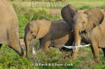 - White Herons feeding on insects disturbed by African Elephants heading to a swamp, Amboseli National Park, Kenya, Africa