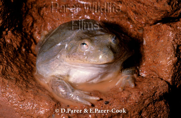 Water-holding frog ← Previous Next → Water-holding frog breaking from skin underground when rain starts, Central Australia Water-holding frog breaking from skin underground when rain starts, Central Australia