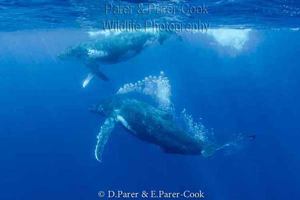 15_643_3c_ddp0339 ← Previous Next → 15. Competition for females can be aggressive and male-to-male threats include bubbles streaming from the blowhole. Males seem to establish a dominance rank by display, songs and fighting. Humpback Whale, Tonga