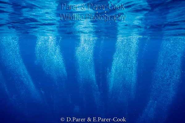 16. Curtains of bubbles rise to the surface as humpback whales vocalize deep below. No one knows really why they sing but it may have something to do with mating or establishing dominance. Both males and females vocalize by forcing air through their blowholes but only males sing complex songs which they repeat. Some sing for 20 minutes at a time with sounds varying in pitch.
