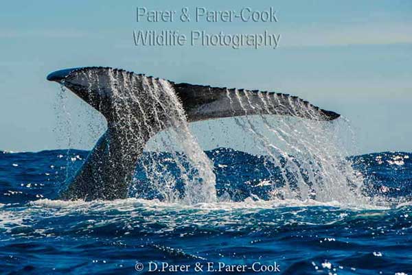 22. Tail slapping humpback whale with water cascading off the wavy trailing edges of its powerful tail. The tail fin can be up to a third of the humpback’s body length. Varying patterns on these flukes allow researchers to distinguish individual animals and photo ID catalogues of the different populations are added to each season. Tail lashes can also be part of surface active groups fighting for a female.