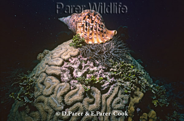 Tritons trumpet feeding on Crown of thorns starfish sawing through its skin with it’s radula and subduing it with paralysing saliva, Great Barrier Reef, Queensland, Australia